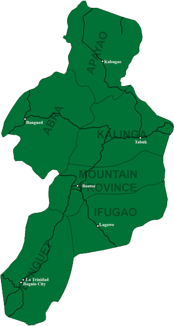 Cordillera Administrative Region (CAR) of the Philippines consists of the provinces of Abra, Benguet, Ifugao, Kalinga, Mountain Province and Apayao. Baguio is the regional center. The Cordillera region encompasses most of the areas within the Cordillera Central mountain range of Luzon, the largest range in the country.